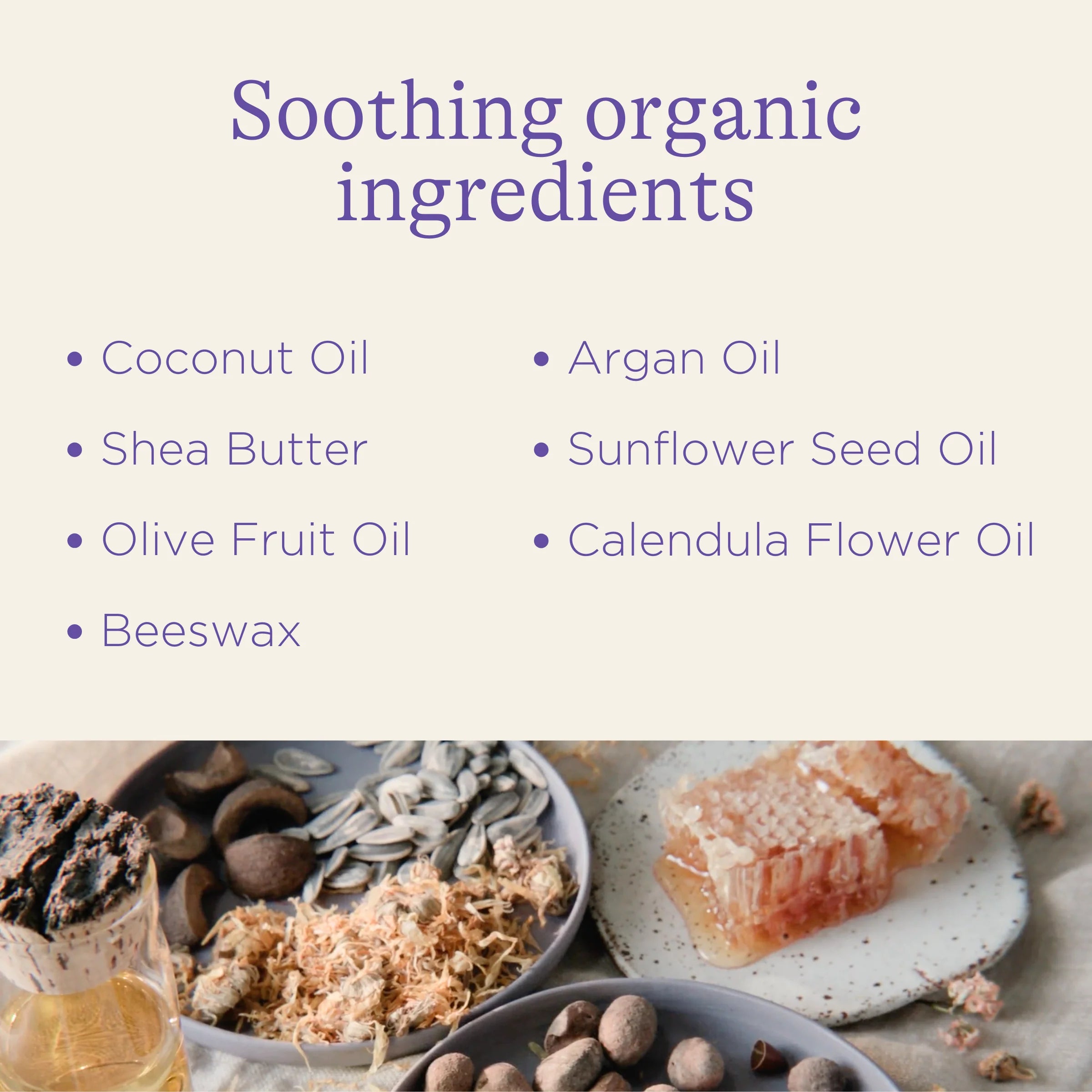 Helianthus Annuus (Sunflower) Seed Oil*, Olea Europaea (Olive) Fruit Oil*, Beeswax*, Cocos Nucifera (Coconut) Oil*, Butyrospermum Parkii (Shea) Butter*, Calendula Officinalis (Calendula) Flower Extract*, Argania Spinosa (Argan) Kernel Oil*